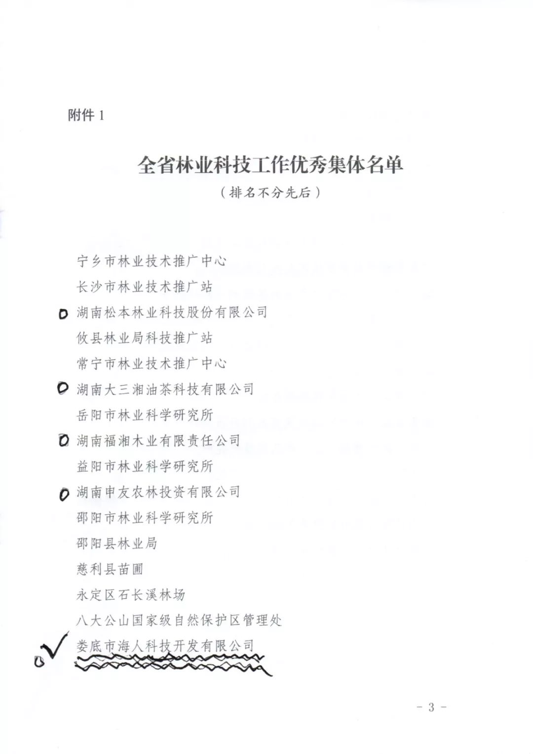 會上,通報表揚了一批在實施創(chuàng)新驅(qū)動發(fā)展戰(zhàn)略、關(guān)鍵技術(shù)攻關(guān)、科技成果推廣、科技精準(zhǔn)幫扶、推動全省林業(yè)發(fā)展和生態(tài)文明建設(shè)作出積極貢獻的一線林業(yè)科技工作者,婁底市海人科技有限公司獲優(yōu)秀企業(yè)榮譽稱號,全省只有五家企業(yè)獲此殊榮!
